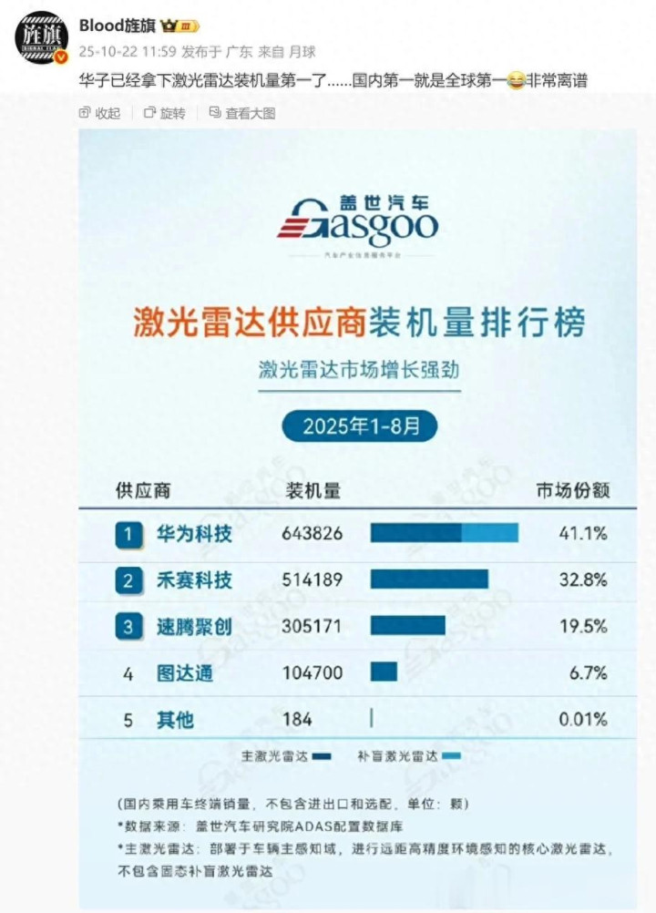 博主“Blood旌旗”在分享时表示:“华子已经拿下激光雷达供应商装机量第一了,国内第一就是全球第一,非常离谱。”